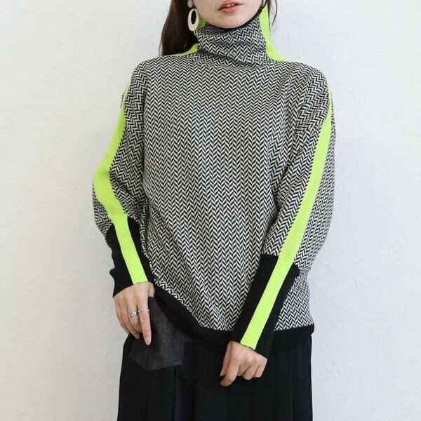 イエロー サイドラインハイネックニット